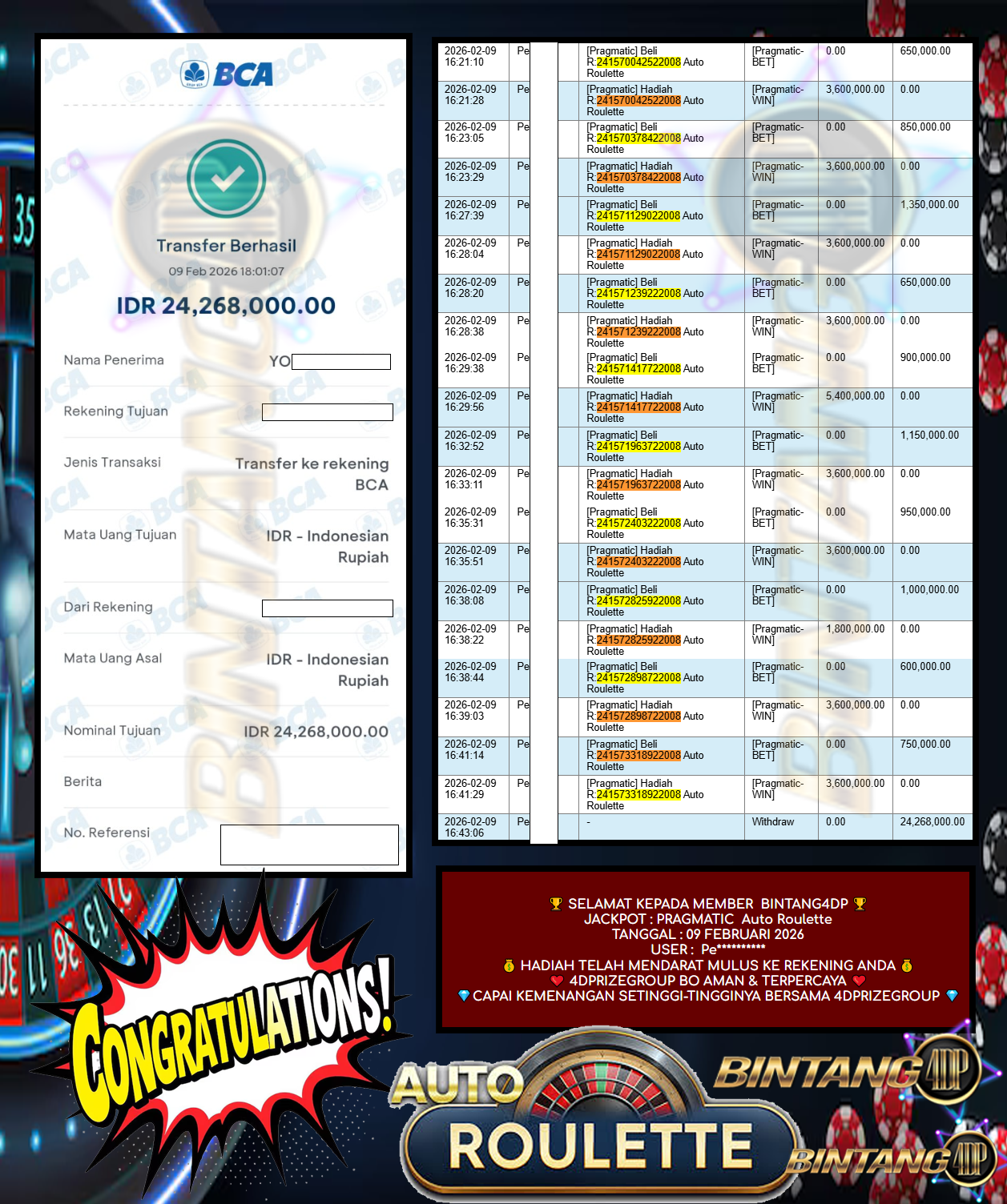- BINTANG4DP JACKPOT PRAGMATIC “Auto Roulette” Rp 24,268.000,- LUNAS